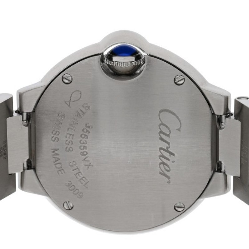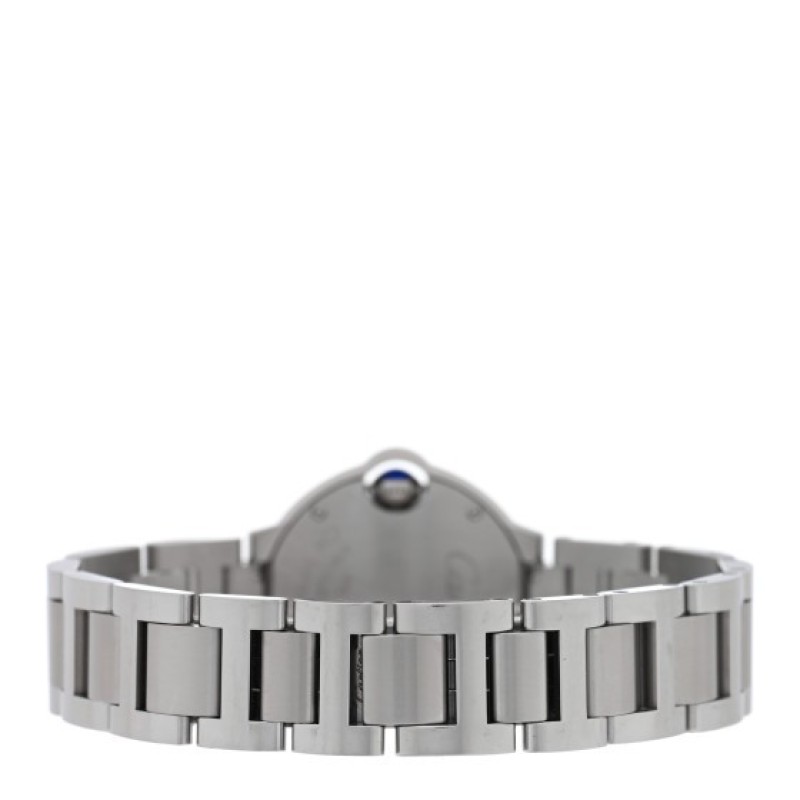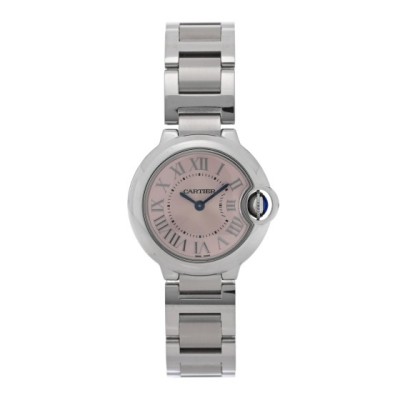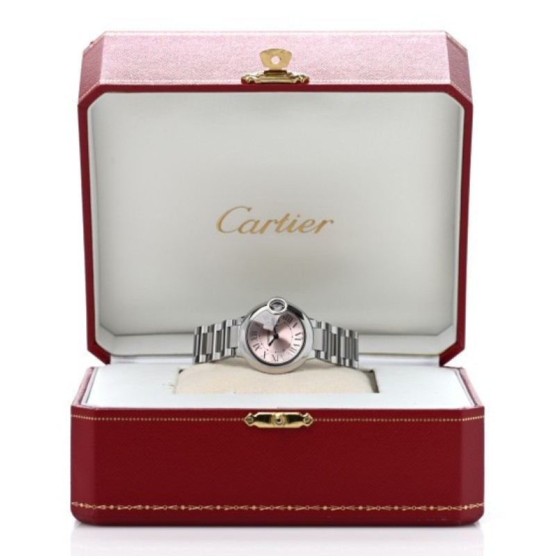 This is an authentic CARTIER Stainless Steel 28mm Ballon Bleu De Cartier Quartz Watch Pink. This elegant watch is crafted of stainless steel. The watch is crafted of stainless steel and features a pink dial, Roman numeral hour markers, blue sword hands, blue cabochon crown, sapphire crystal, and a quartz movement.