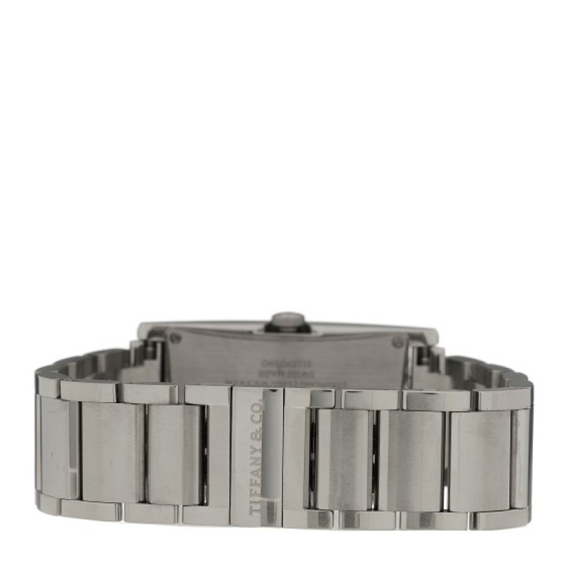 This is an authentic TIFFANY Stainless Steel Diamond Bezel 25mm East West Quartz Watch White. The watch is crafted of stainless steel and features an "east/west" facing dial in white, Arabic numeral hour markers, diamond bezel, sapphire crystal, and a quartz movement.