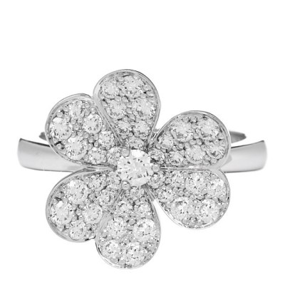This is an authentic VAN CLEEF & ARPELS 18K White Gold Diamond Small Frivole Ring size 52 or 6. The ring is crafted of 18-karat white gold and features a diamond accented flower motif, weighing approximately .80 total carat weight.