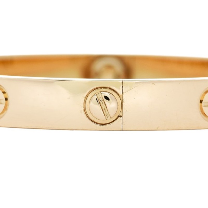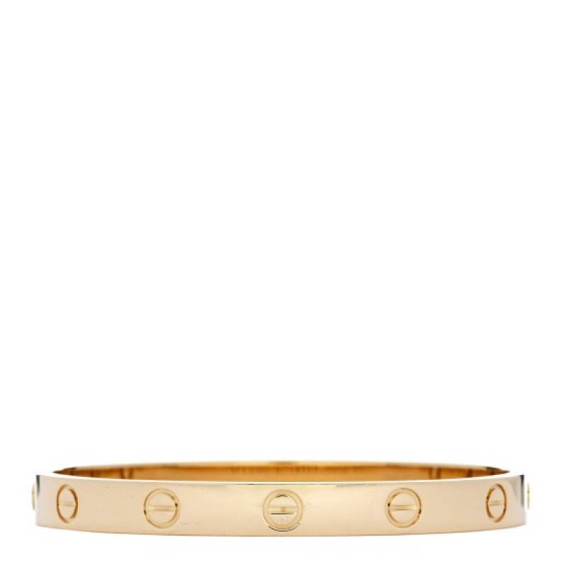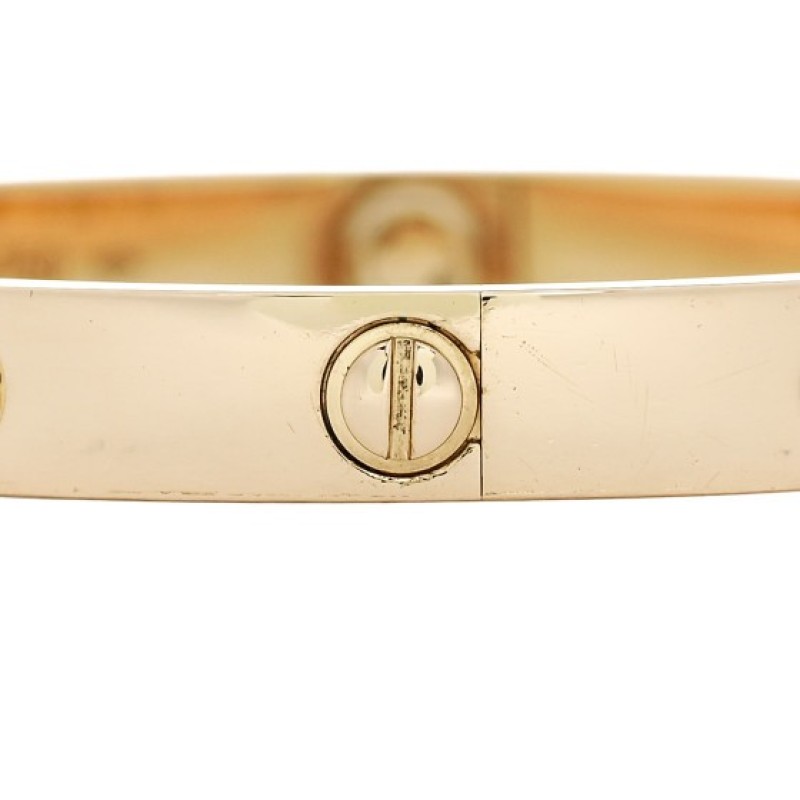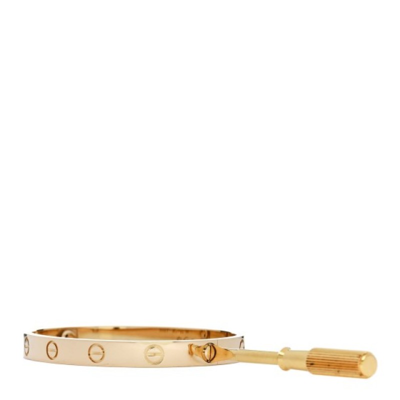 This is an authentic CARTIER 18K Yellow Gold LOVE Bracelet size 16. The bracelet is crafted of 18 karat yellow gold and features the signature engraved LOVE screw motifs throughout the bangle. The bracelet also features two functional screws on either side to open and close.