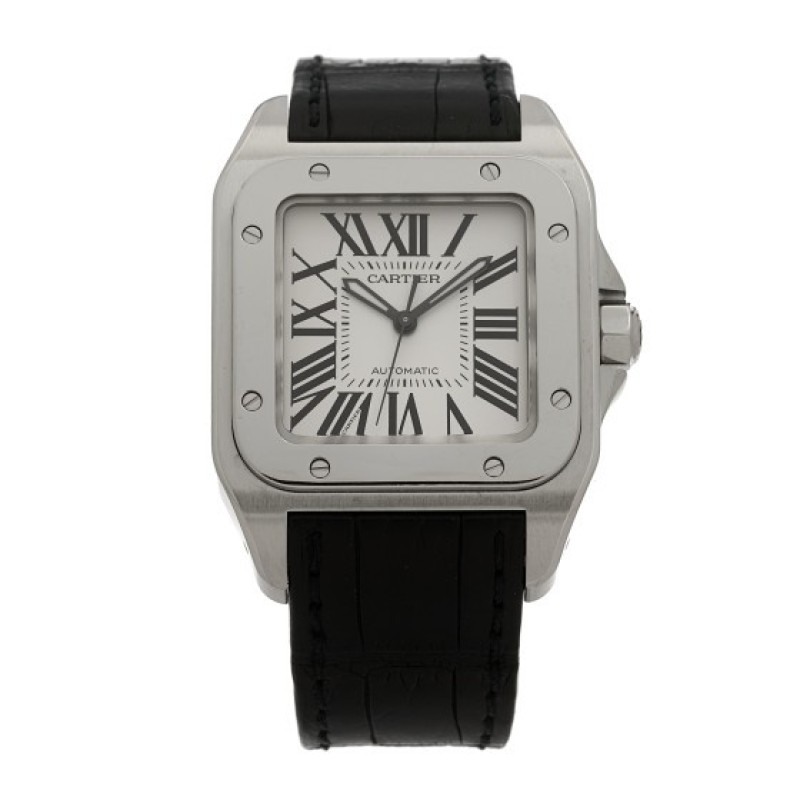This is an authentic CARTIER Stainless Steel Alligator 33mm Santos 100 Automatic Watch. The watch is crafted of stainless steel and features a white dial with black Roman numeral hour markers, black alligator strap, sapphire crystal, and an automatic movement.