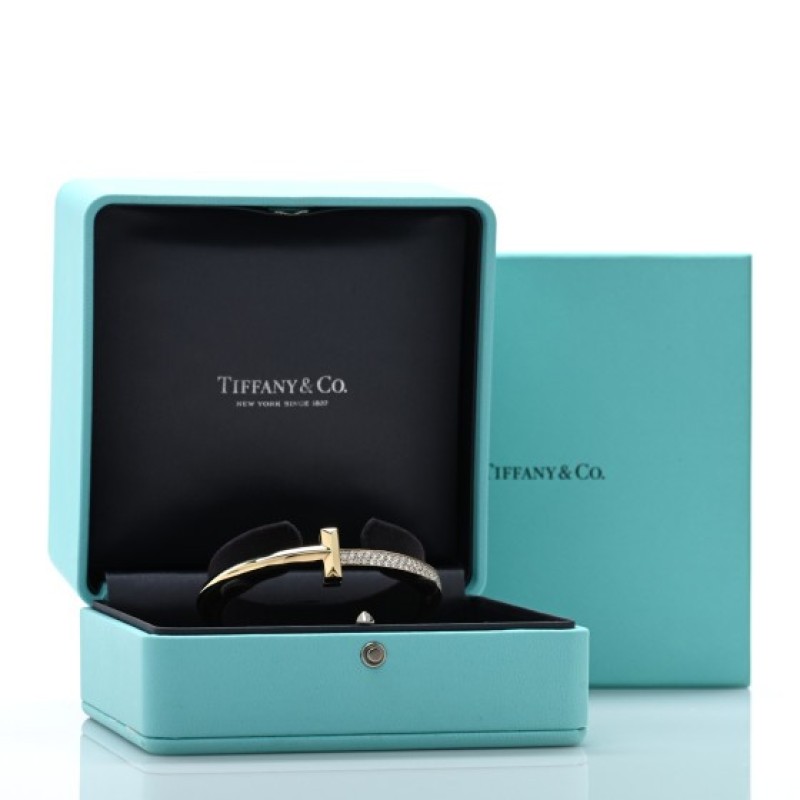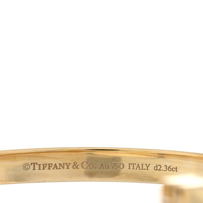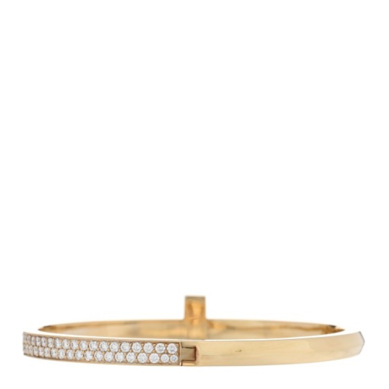 This is an authentic TIFFANY 18K Yellow Gold Diamond Wide T1 Hinged Bangle Bracelet. The bracelet is crafted of 18 karat yellow gold and features a hinged T motif bangle pave-set with round brilliant cut diamonds, approximately 2.36 total carat weight. PLEASE NOTE: The closing mechanism for the case is compromised, however the bracelet is not affected.