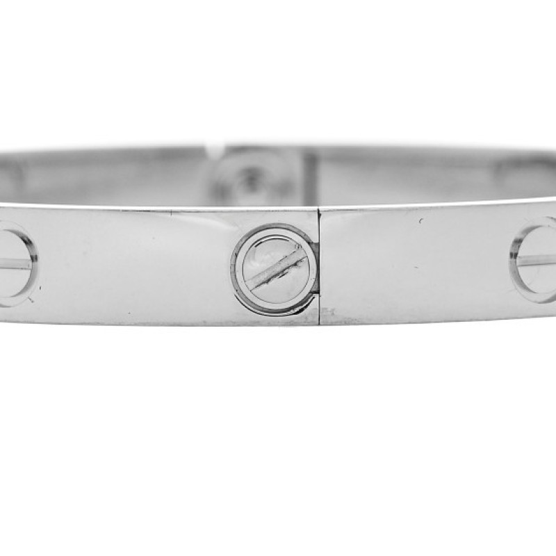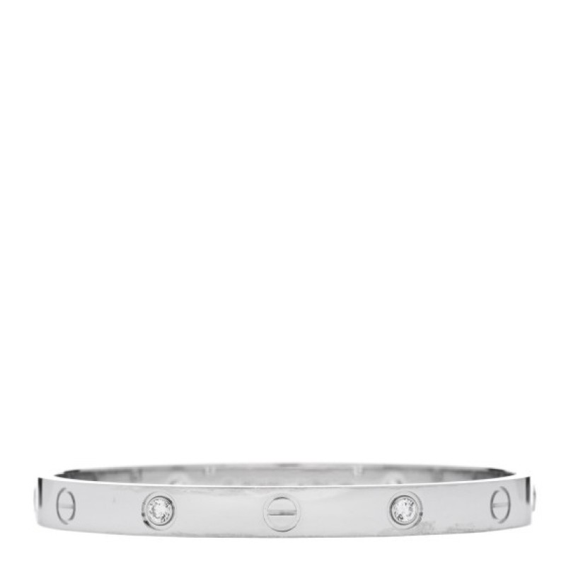 This is an authentic CARTIER 18K White Gold 4 Diamond LOVE Bracelet size 17. Part of Cartier's classic LOVE collection, this 18 karat white gold bracelet features the engraved screw symbol throughout the band, along with four round brilliant cut diamonds weighing approximately .42 total carat weight. The bracelet also features two functional screws on either side to open and close.