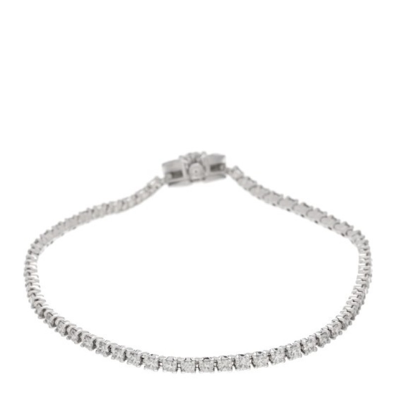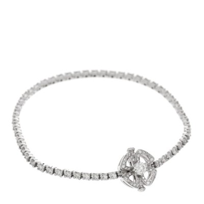 This is an authentic BULGARI 18K White Gold Diamond Fiorever Bracelet size S. The bracelet is crafted of 18 karat white gold and features a full diamond strand and a four-petal flower motif set with round brilliant cut diamonds, weighing approximately 2.25 total carat weight.