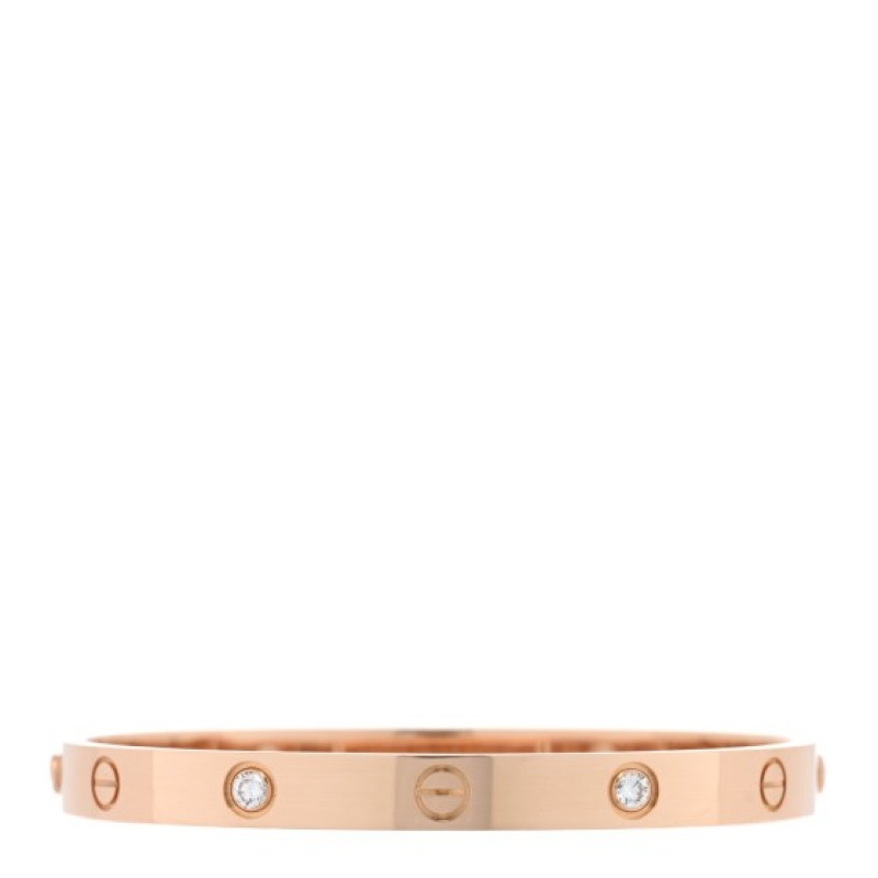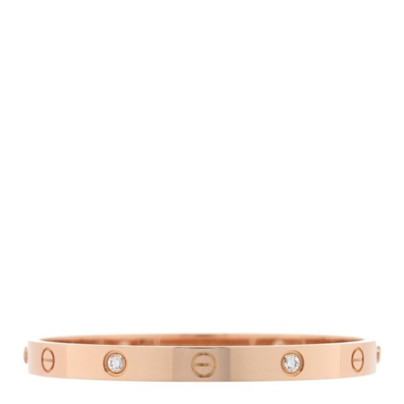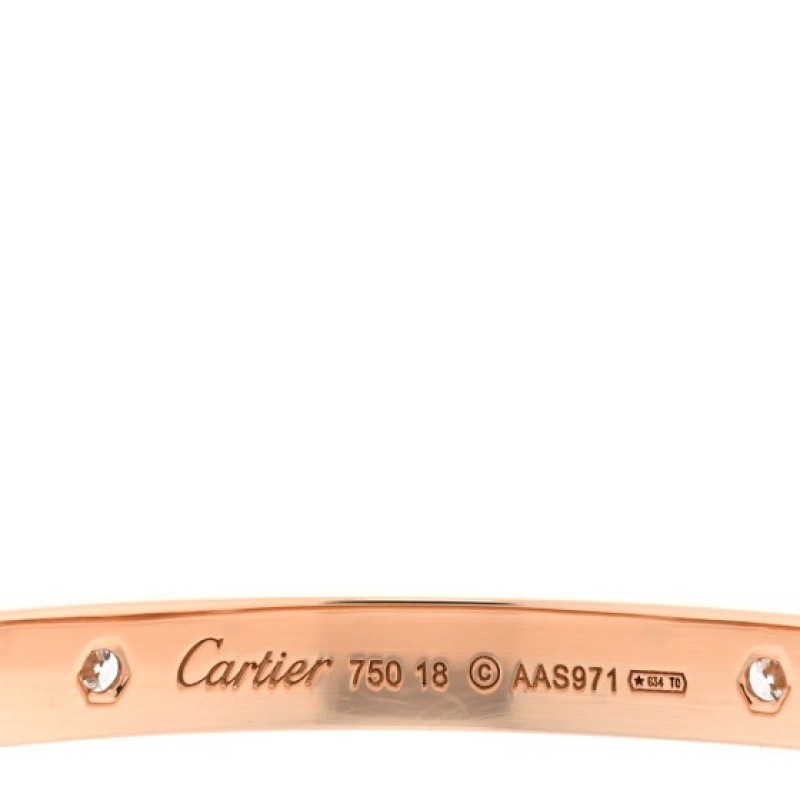 This is an authentic CARTIER 18K Pink Gold 4 Diamond LOVE Bracelet size 18. Part of Cartier’s classic LOVE collection, this stunning 18 karat pink gold bracelet features the signature engraved LOVE motif alternating between four round brilliant cut diamonds, approximately .42 total carat weight. The bracelet also features two functional screws on either side to open and close.