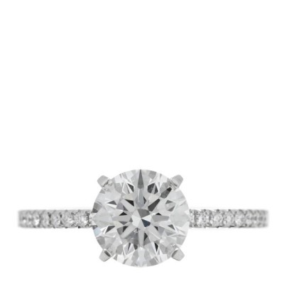This is an authentic TIFFANY Platinum Diamond 1.58ct True Engagement Ring 51 5.75. The ring is crafted of platinum and features a round brilliant cut diamond, approximately 1.58 carat with F color and VS1 clarity, along with approximately .29 total carat weight of additional diamonds along the setting and the top half of the band. PLEASE NOTE: The center diamond of this ring is a Tiffany heritage stone from another design which was reset into the current setting by Tiffany.