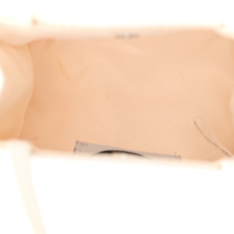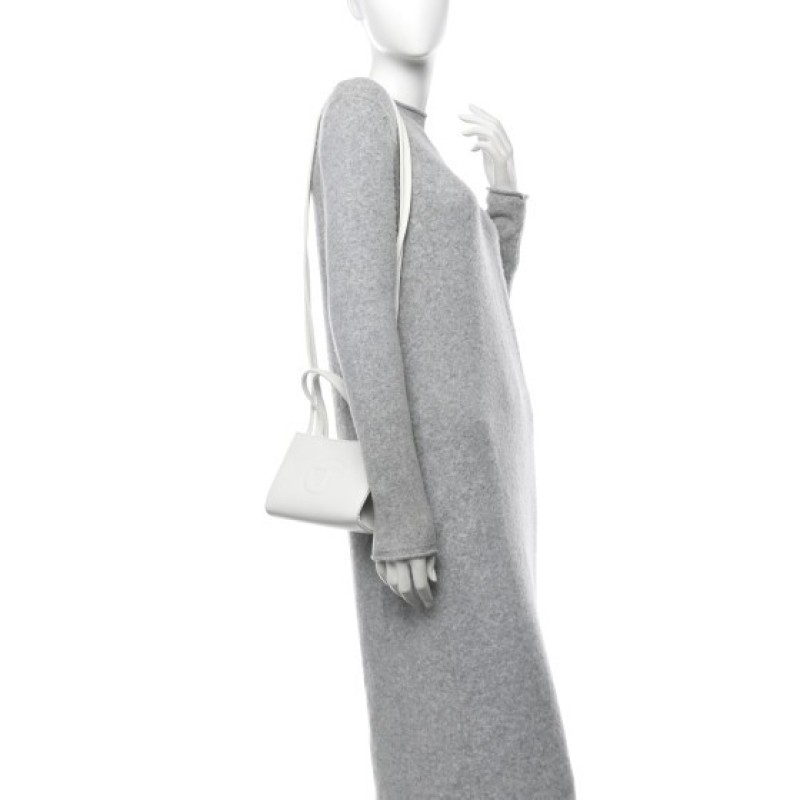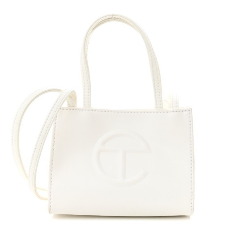 This is an authentic TELFAR Vegan Leather Small Shopping Bag in White. This is a tote crafted of synthetic leather in white with the iconic raised Telfar logo at the front. The shoulder bag has short top handles, and two long shoulder straps. The top secures with a magnet snap and opens to a matching fabric lined interior.