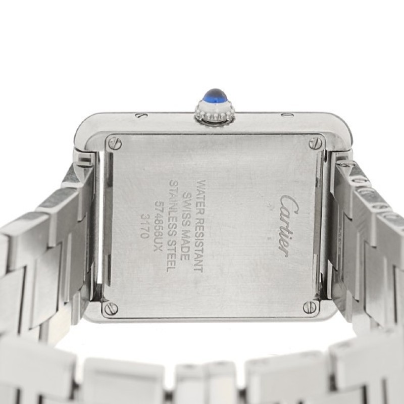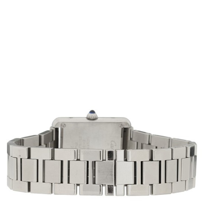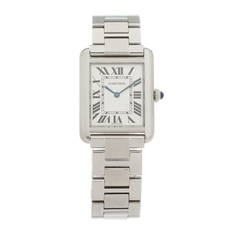 This is an authentic CARTIER Stainless Steel 24mm Tank Solo Quartz Watch. The watch is crafted of stainless steel and features a white dial with black Roman numeral hour markers, blue sword-shaped hands, blue spinel cabochon crown, sapphire crystal, steel bracelet, and a quartz movement.