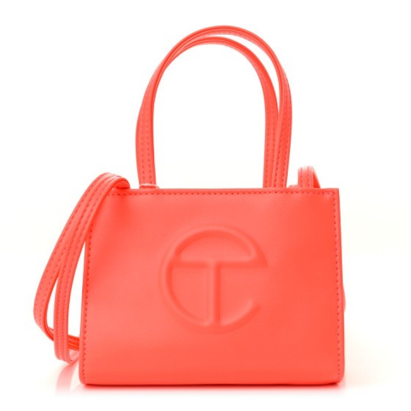 This is an authentic TELFAR Vegan Leather Small Shopping Bag in Hazard. This is a tote crafted of synthetic leather in neon pink with the iconic raised Telfar logo at the front. The shoulder bag has short top handles, and two long shoulder straps. The top secures with a magnet snap and opens to a matching fabric-lined interior.