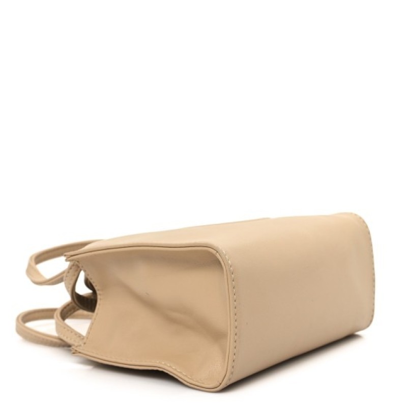 This is an authentic TELFAR Vegan Leather Small Shopping Bag in Cream. This mini tote is constructed of faux leather in beige with a raised Telfar logo at the front. It features thin leather handles, a long crossbody strap, and a beige fabric interior.