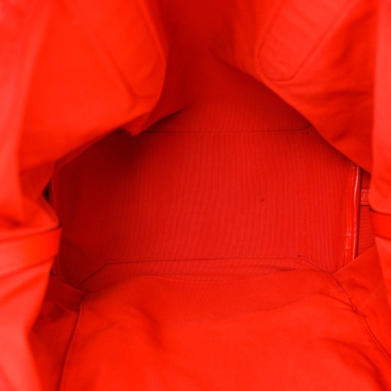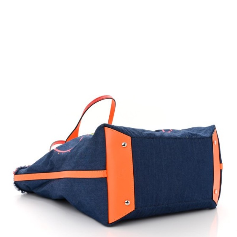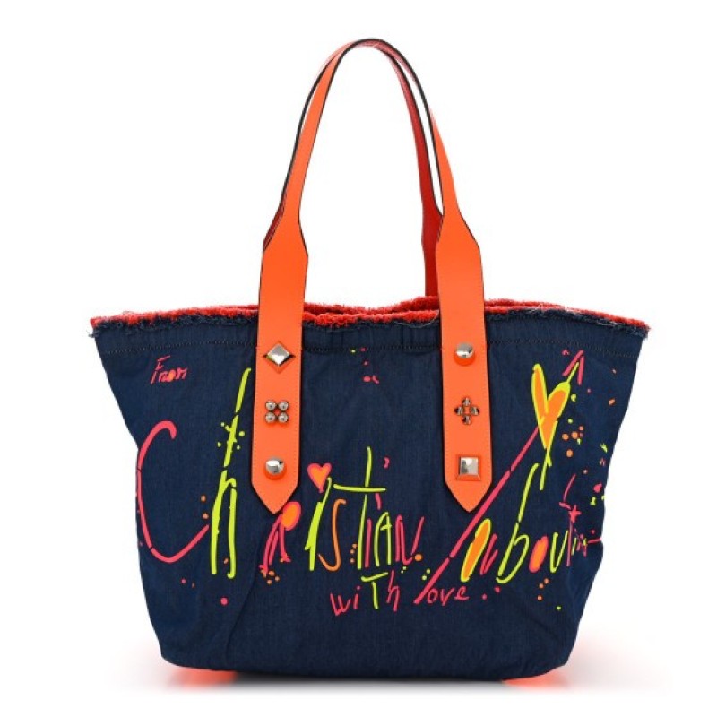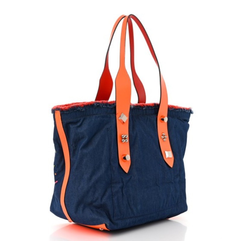 This is an authentic CHRISTIAN LOUBOUTIN Denim Frangibus Printed Tote in Blue and Multicolor. This chic tote is crafted of blue denim with orange leather accents. It features orange leather strap handles and silver stud accents and opens to a red canvas interior.