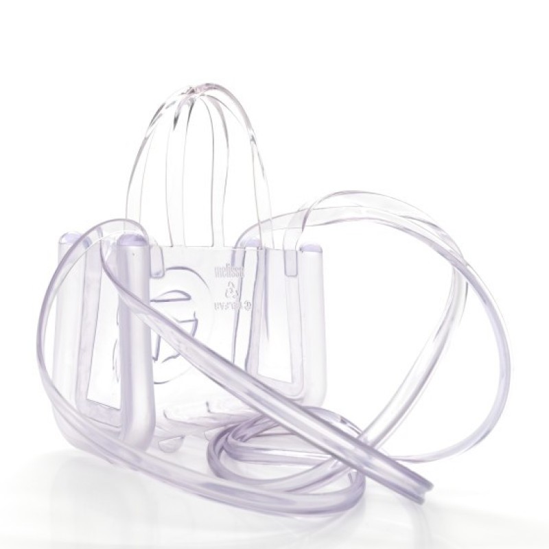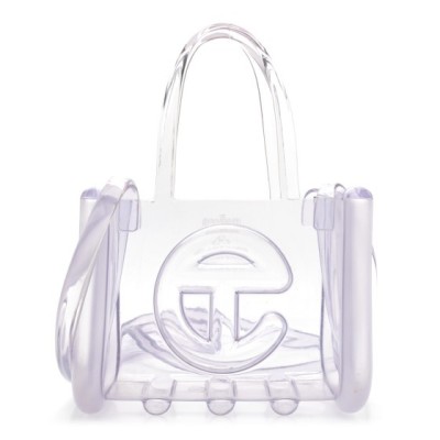 This is an authentic TELFAR x MELISSA Jelly Small Shopping Bag in Clear. This chic water-resistant tote is crafted of clear PVC with the iconic Telfar logo at the front. The shoulder bag features short top handles and two long shoulder straps. The top opens to a matching plastic interior.