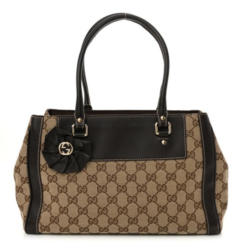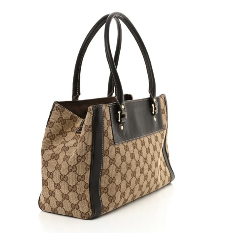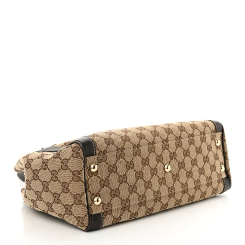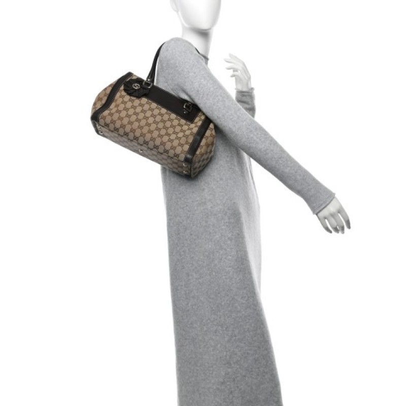 This is an authentic GUCCI Monogram Trophy Satchel in Ebony. This stylish tote is finely crafted of Gucci GG monogram canvas in beige. The bag features a side patch pocket, and chocolate brown leather trim and top handles, with polished light gold hardware. The top zipper opens the bag to a dark brown fabric interior with patch pockets.