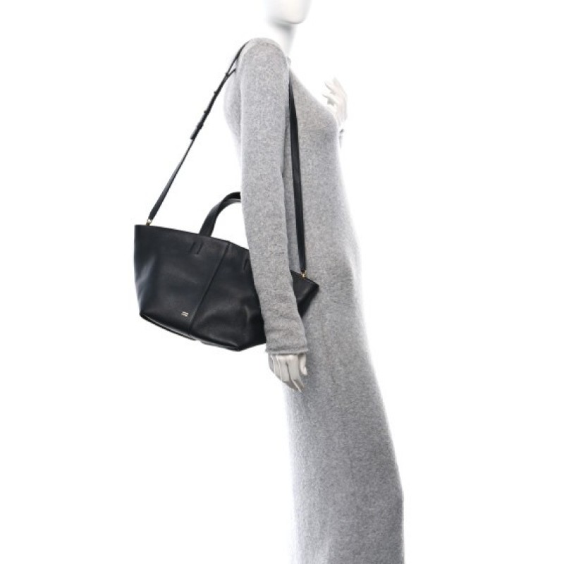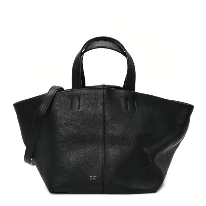 This is an authentic MANSUR GAVRIEL Calfskin Tulipano Bag in Black. This tote is crafted of grained calfskin leather in black. It features leather top handles and a removable, adjustable black leather shoulder strap. The top zipper opens to a beige fabric interior with a patch pocket.