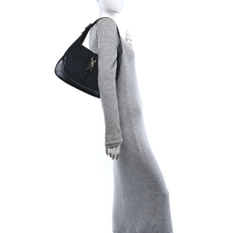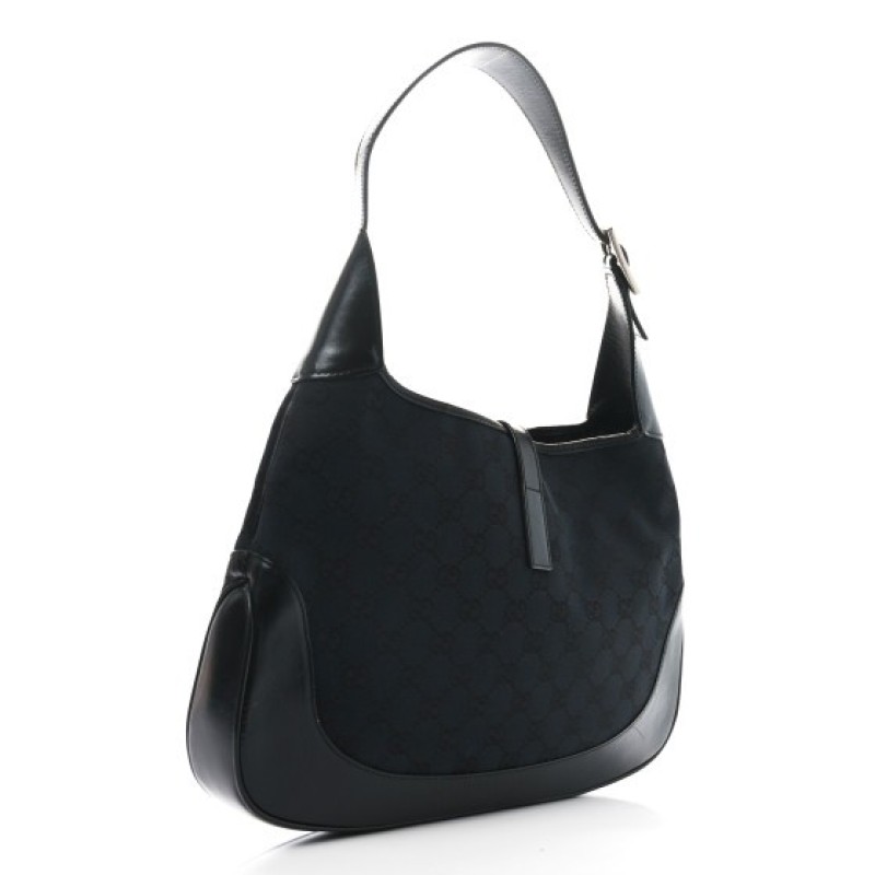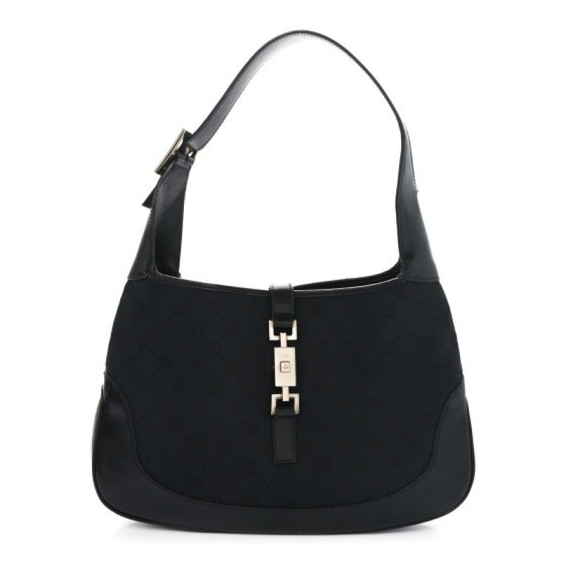 This is an authentic GUCCI Monogram Small Jackie O Hobo in Black. This bag crafted of black monogram canvas, black leather trim and gunmetal hardware. The top opens to a black fabric interior with a zipper pocket.