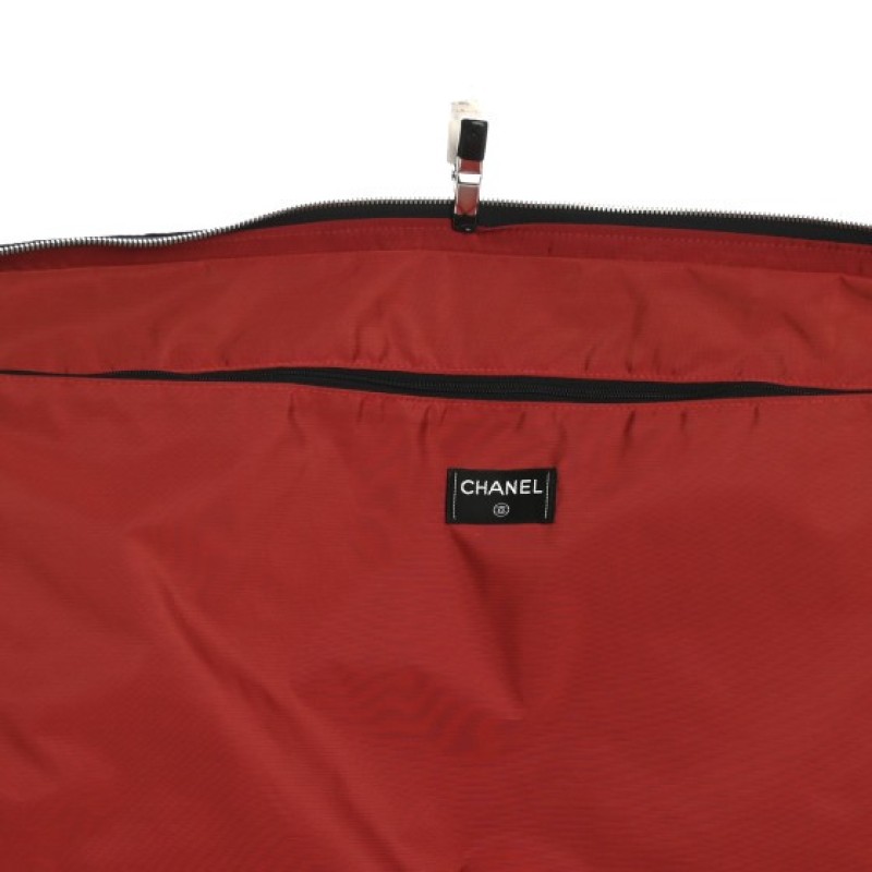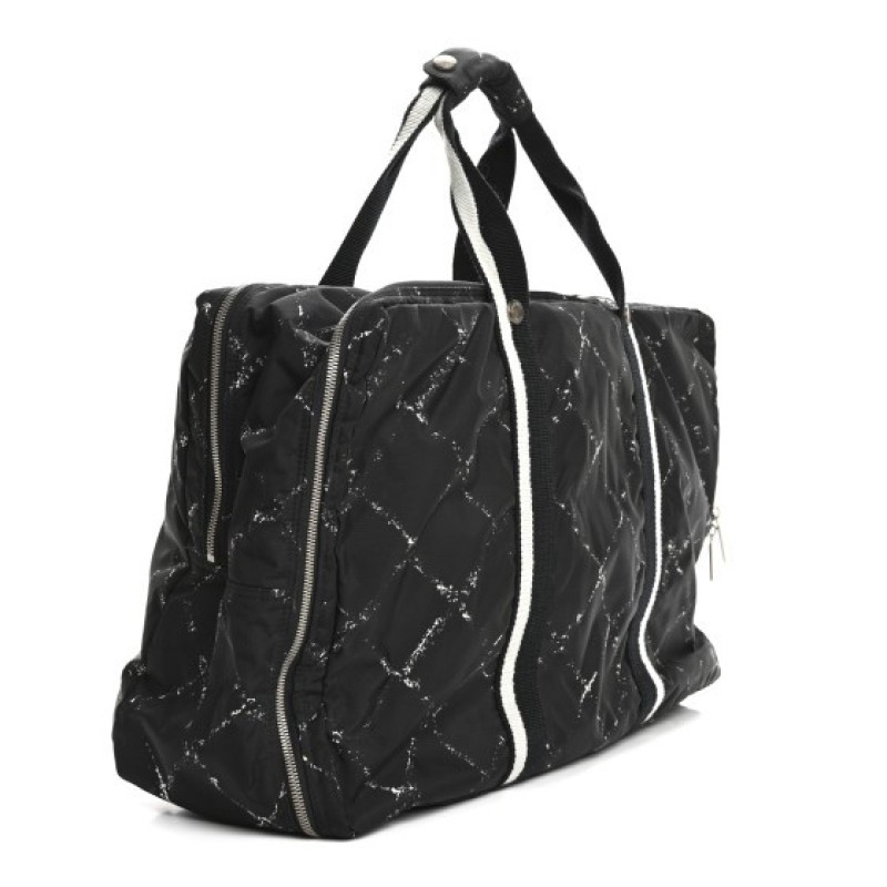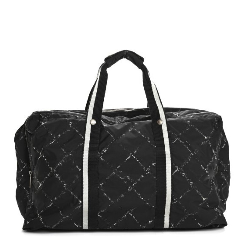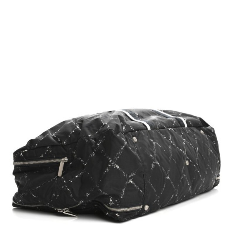 This is an authentic CHANEL Nylon Large Travel Duffle Bag in Black. This classic travel tote is finely crafted of black and white nylon. The bag features a striped canvas handles and silver hardware. The top zippers open to a plastic and red nylon interior.