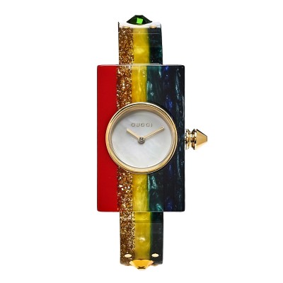 This is an authentic GUCCI Stainless Steel Plexiglass Mother of Pearl 24mm Rainbow Quartz Watch. This watch is crafted of multicolored acrylic plexiglass and features a gold case with a mother of pearl dial, gold sword hands, and a quartz movement.