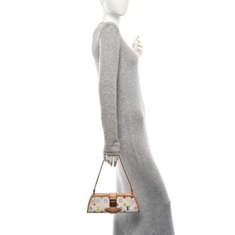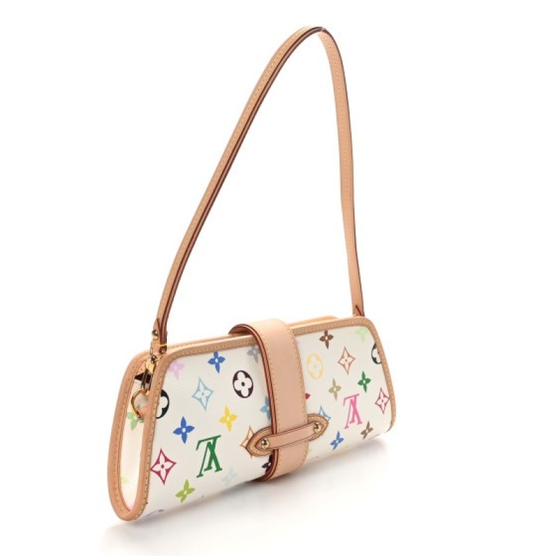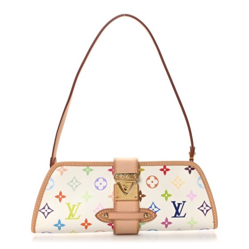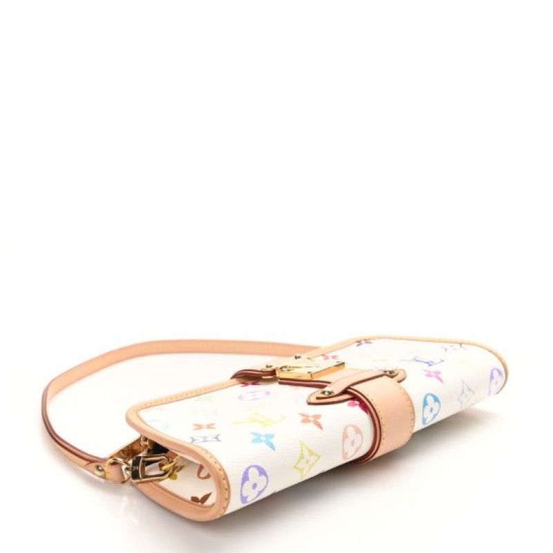 This is an authentic LOUIS VUITTON Monogram Multicolor Shirley in White. This small handbag is crafted of a Multicolore monogram in 33 vivid colors on white coated canvas. The bag is reinforced with natural vachetta cowhide leather including trim along the sides and top, and a crossover strap with a gold clasp, and an optional leather shoulder strap. The top zipper opens to a rich ruby red microfiber interior.