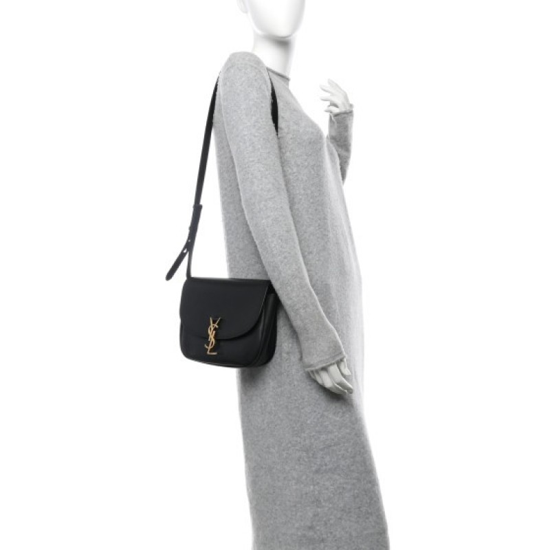 This is an authentic SAINT LAURENT Smooth Calfskin Classic Monogram Medium Kaia Satchel in Black. This stylish messenger bag is crafted of smooth calfskin leather in black. It features an adjustable leather cross-body strap with aged gold hardware and a crossover flap with an aged gold YSL logo. The flap opens to reveal a black suede interior with a patch pocket.