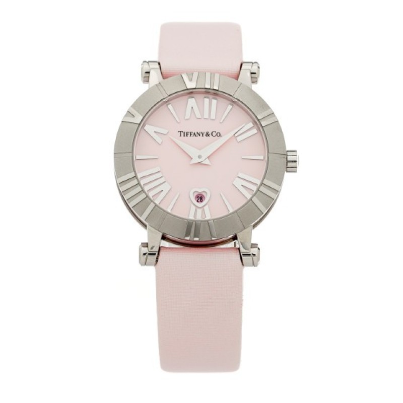 This is an authentic TIFFANY Stainless Steel Satin 30mm Atlas Belt Quartz Watch Pink. The watch is crafted of stainless steel and features a pink dial, pink satin strap, sapphire crystal, and a quartz movement.