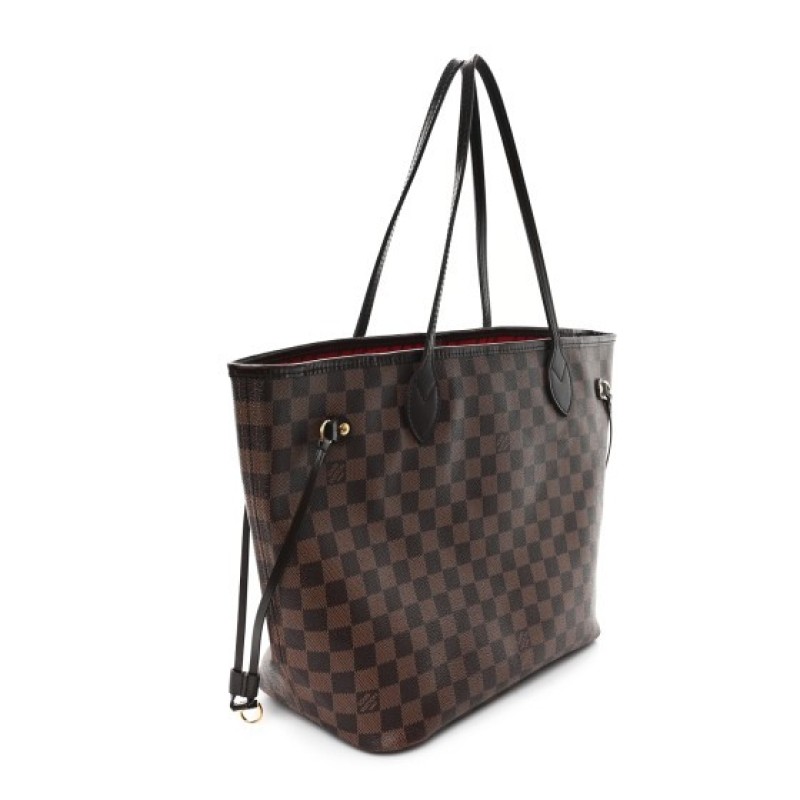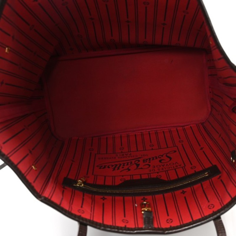 This is an authentic LOUIS VUITTON Damier Ebene Neverfull MM. This chic tote is crafted of classic Louis Vuitton Damier in brown on coated canvas. The shoulder bag features chocolate brown cowhide leather trim, shoulder straps, side cinch cords, and has polished brass hardware. The top is open to a striped red fabric interior with a hanging zipper pocket.