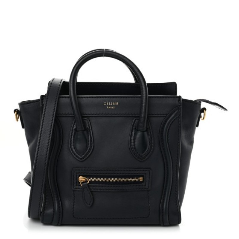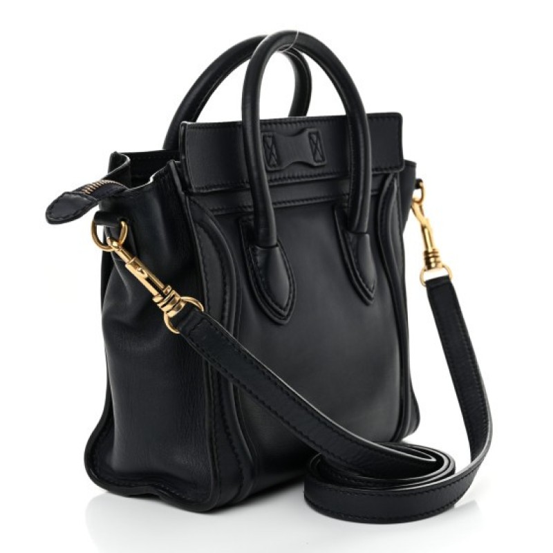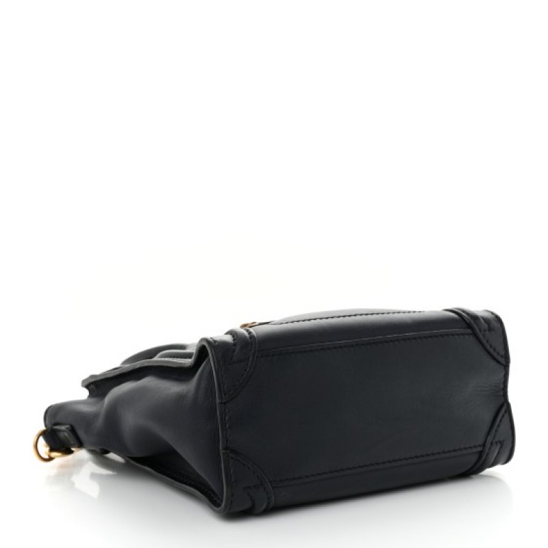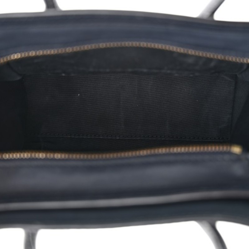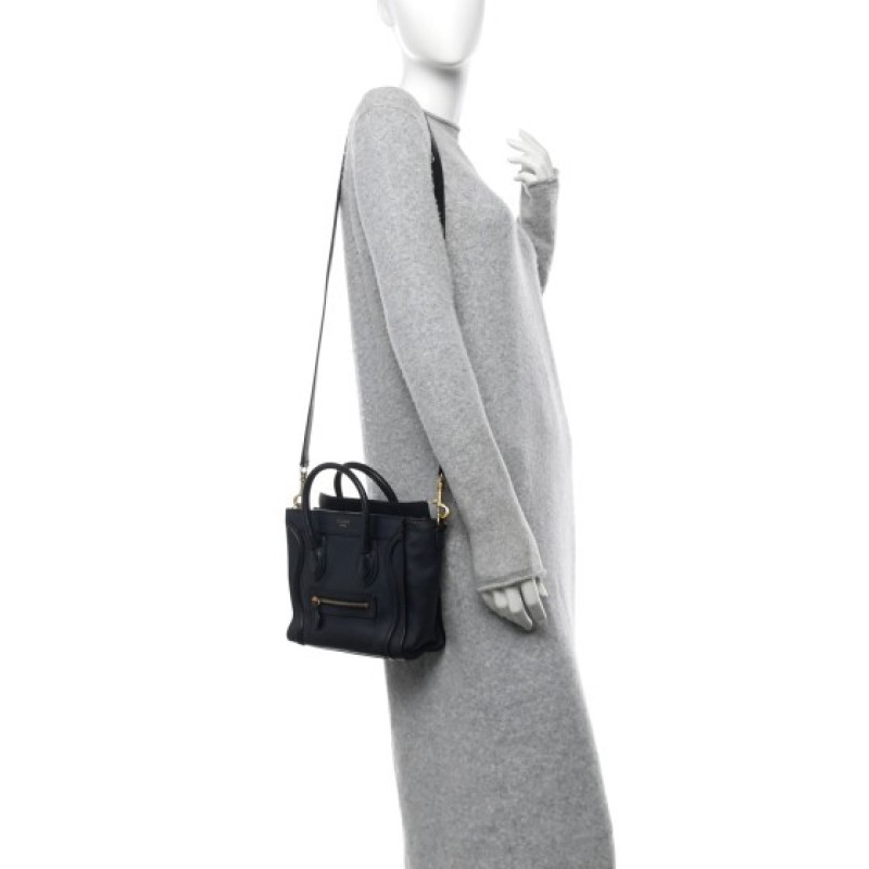 This is an authentic CELINE Smooth Calfskin Nano Luggage in Ink. This stylish small tote is crafted of calfskin leather in dark blue. This shoulder bag features rolled leather top handles, an optional shoulder strap with aged gold clasps and decorative leather detailing. The top unzips to a matching leather interior with a patch pocket.