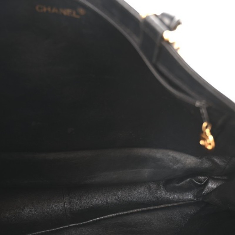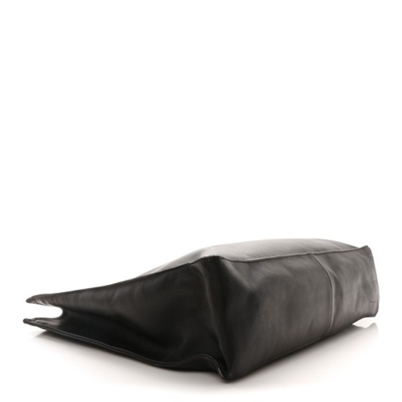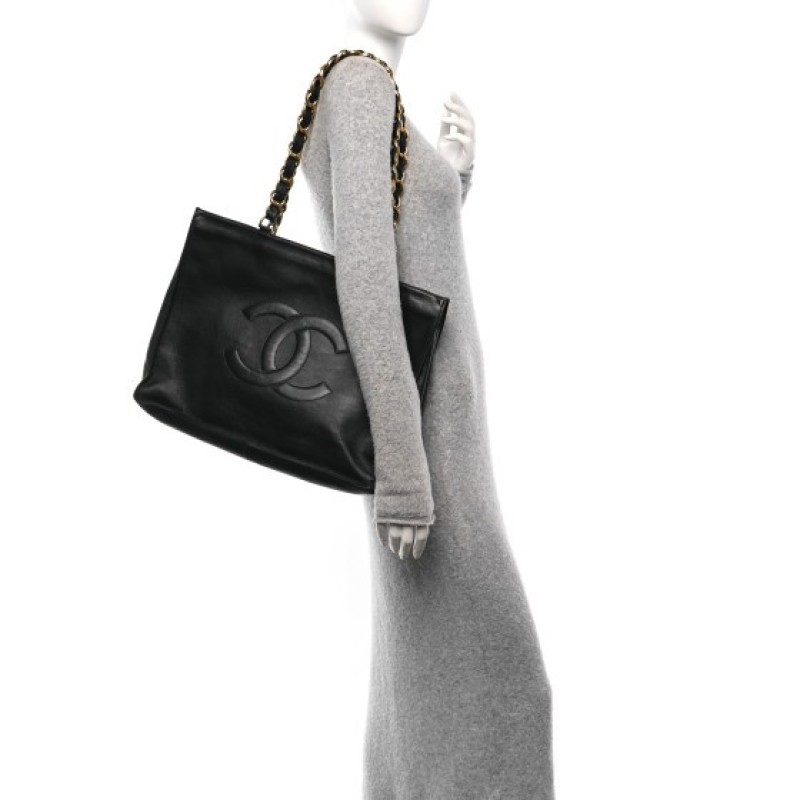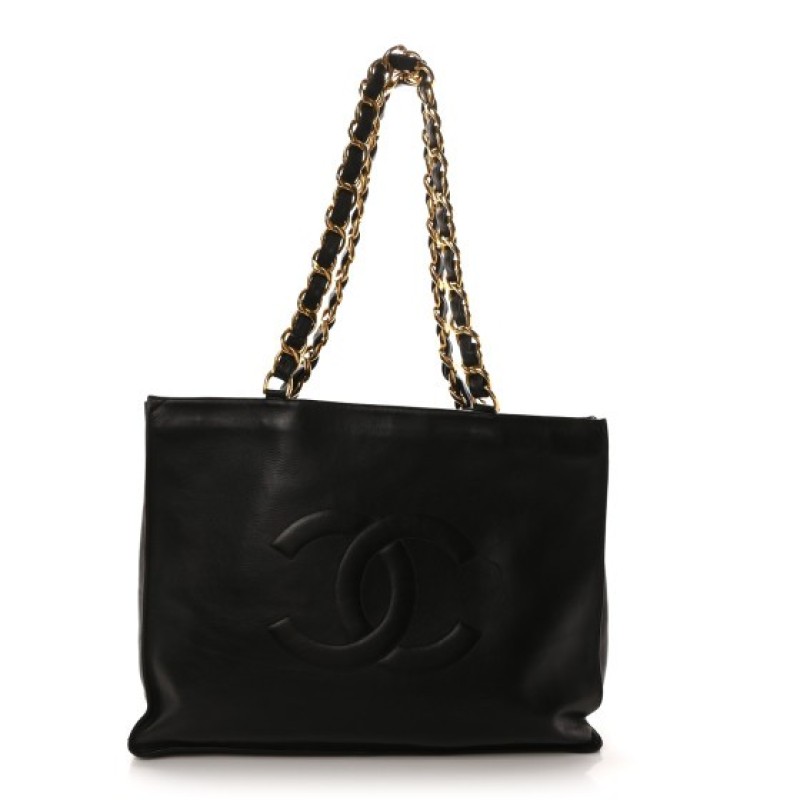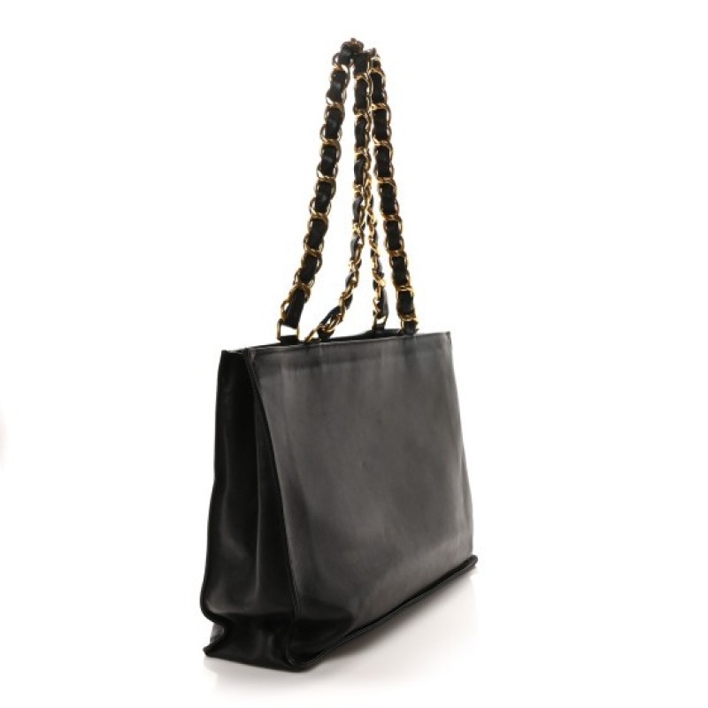 This is an authentic CHANEL Lambskin CC Tote in Black. This sleek tote is crafted of smooth black lambskin leather with a Chanel CC logo embossed on the front. The bag features oversized leather threaded gold chain link shoulder straps and the top is open to a spacious black leather interior with a hanging zipper pocket.