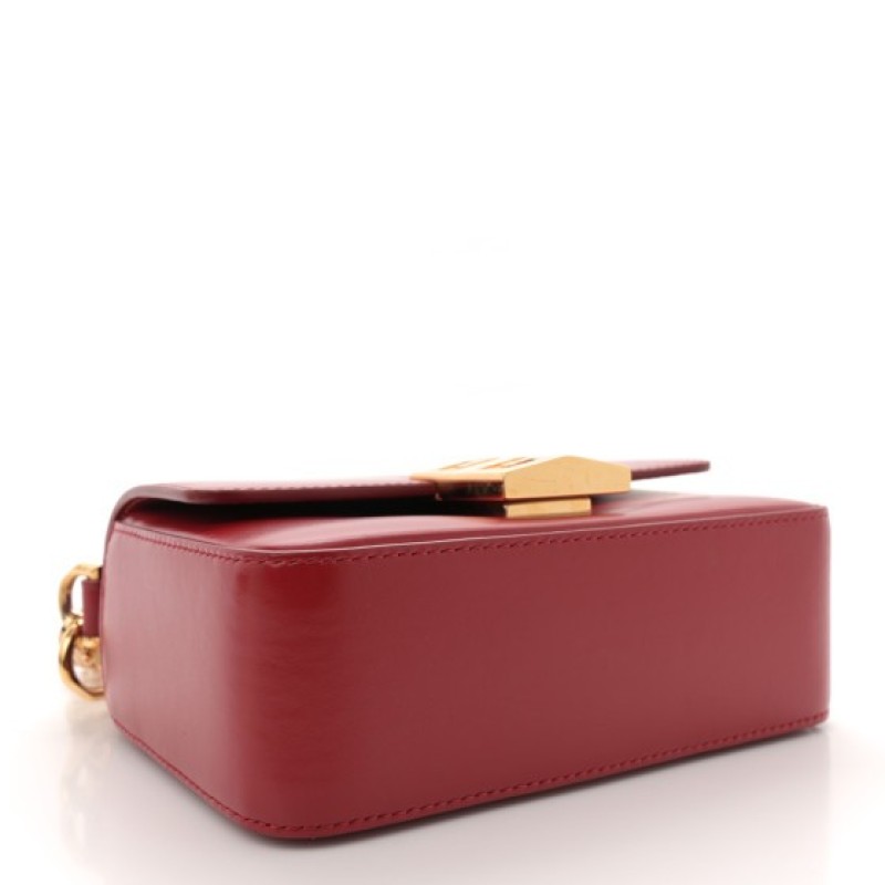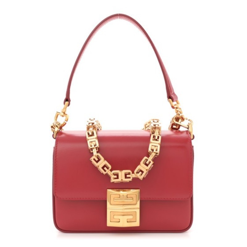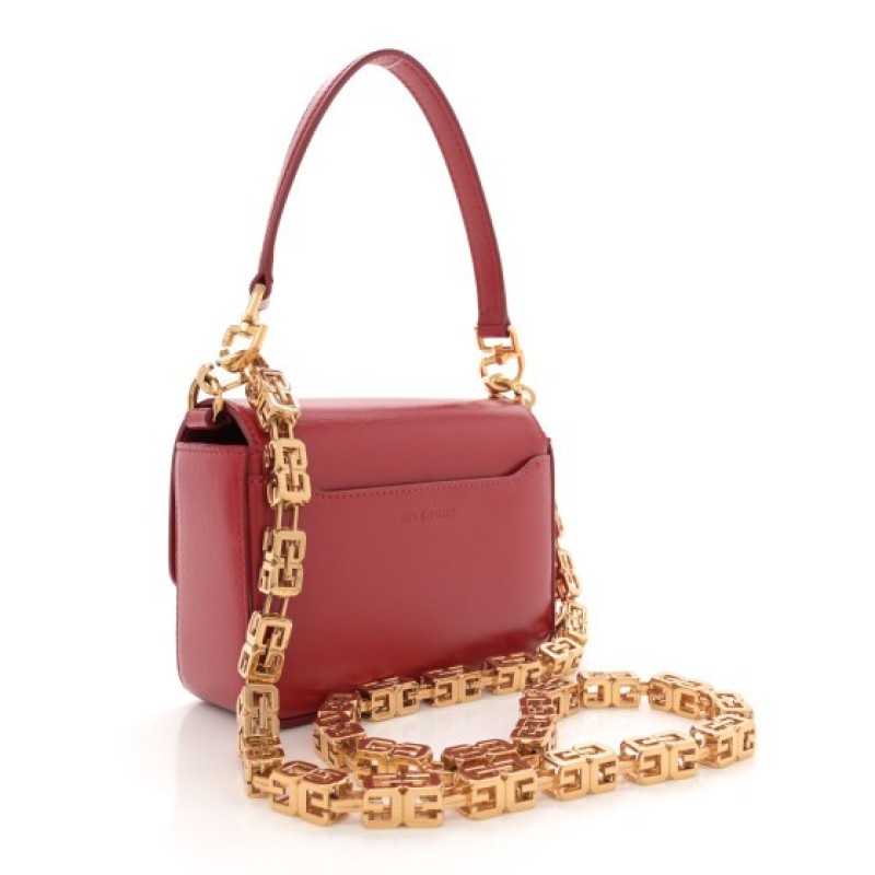 This is an authentic GIVENCHY Box Calfskin Small 4G Cube Chain Shoulder Bag in Dark Red. This handbag is crafted of smooth calfskin leather in red. It features a leather top handle, and gold hardware. The flap opens to a beige leather interior with a patch pocket.