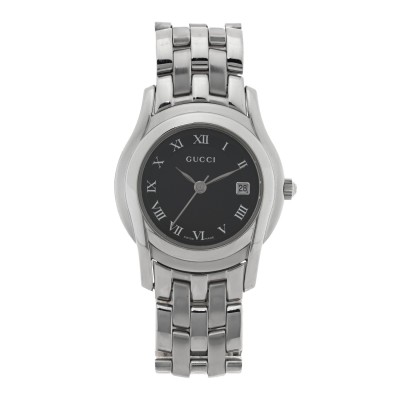 This is an authentic GUCCI Stainless Steel 27mm 5500L Quartz Watch Black. The watch is crafted of stainless steel and features a black dial with Roman numeral hour markers, date window, sapphire crystal, link bracelet with double deployment clasp and a quartz movement.