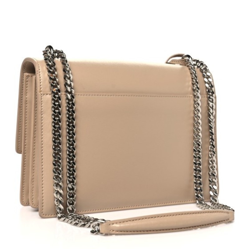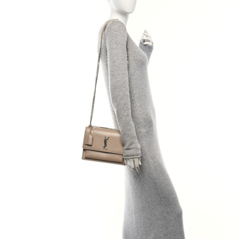 This is an authentic SAINT LAURENT Calfskin Medium Monogram Sunset in Dark Beige. This stunning shoulder bag is crafted of smooth calfskin in Dark Beige. The bag features a matching shoulder strap with an aged silver chain, a front facing flap with a signature silver YSL logo, gusseted sides, and both an interior and exterior pocket. This fold over bag is complete with magnetic snap that opens to a spacious suede and leather interior.