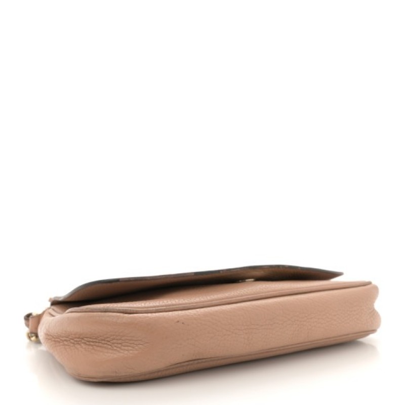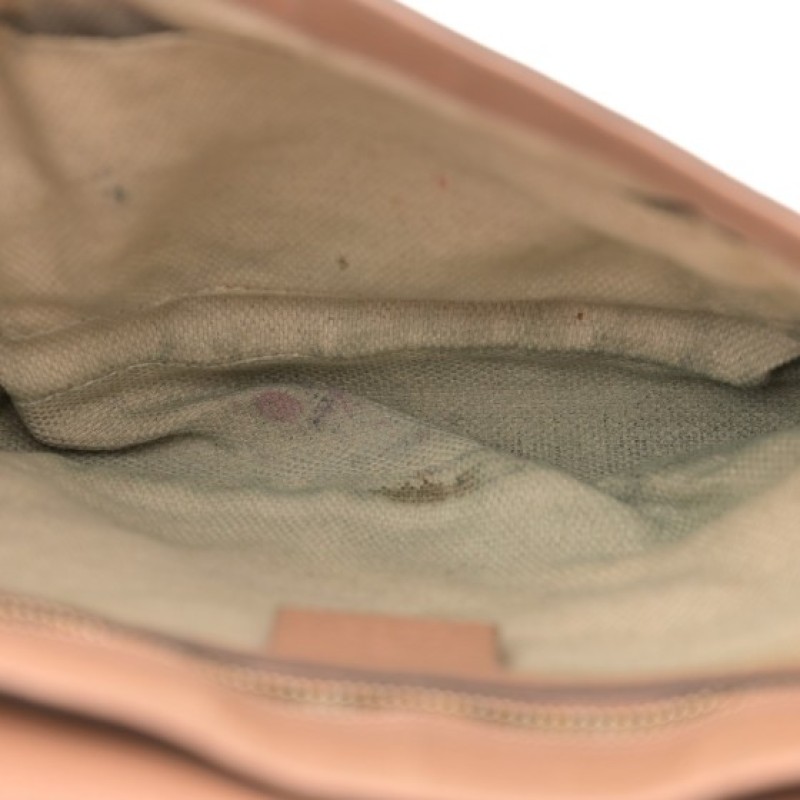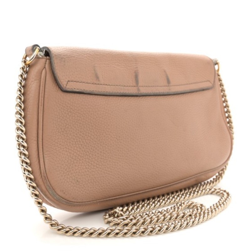 This is an authentic GUCCI Pebbled Calfskin Medium Soho Flap Crossbody in Camelia. This crossbody flap bag is crafted of fine-grained leather in beige. The handbag features a long polished light gold chain shoulder strap, a leather tassel, and a prominent stitched interlocking G logo on the front flap. This opens to a natural linen interior with zipper and patch pockets.