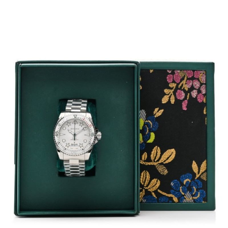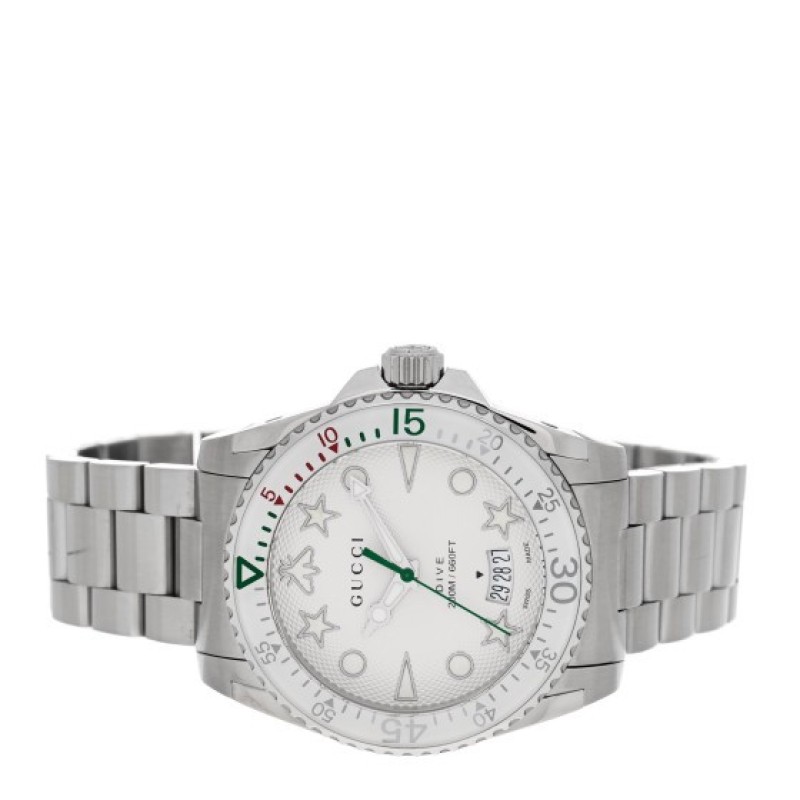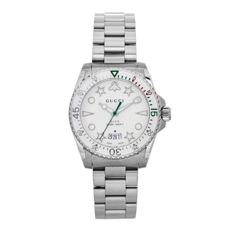 This is an authentic GUCCI Stainless Steel 40mm Dive Quartz Watch White. The watch is crafted of stainless steel and features a white dial with bumble bee and star hour markers, date indicator, sapphire crystal, and a quartz movement.