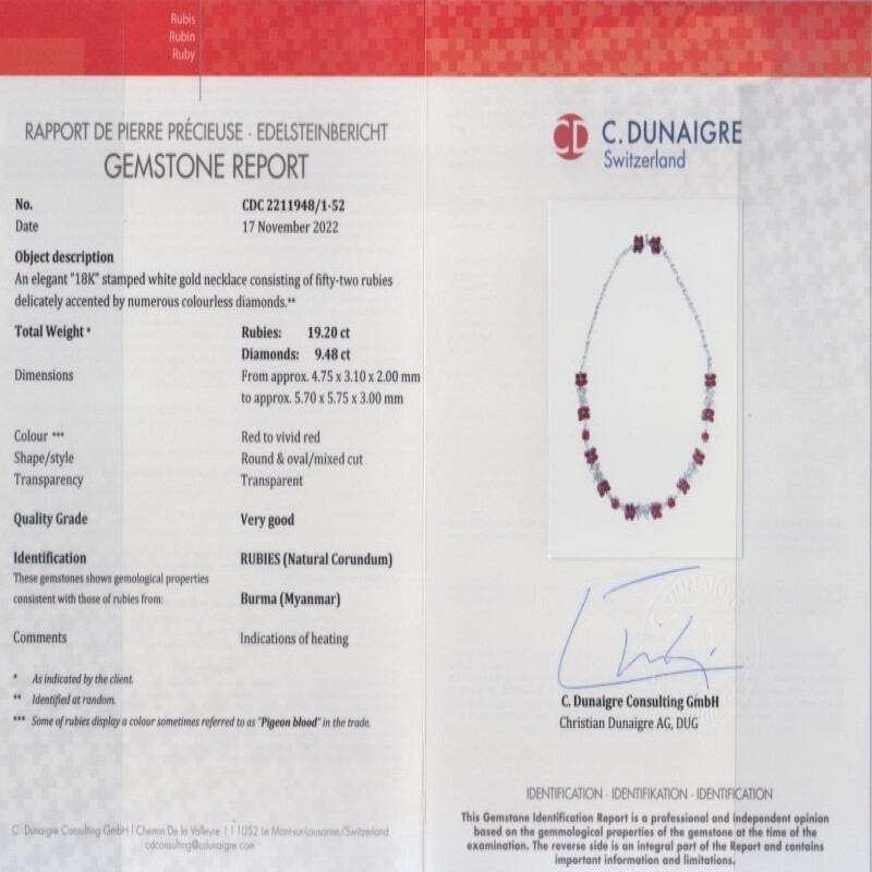 Accompanied by C. Dunaigre report no. CDC 2211948/1-52, dated 17 November 2022, stating that the 19.20 carats of rubies are of Burma (Myanmar) origin and show indications of heating, some rubies display a colour referred to as "Pigeon Blood"
