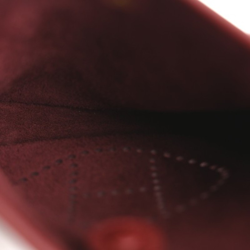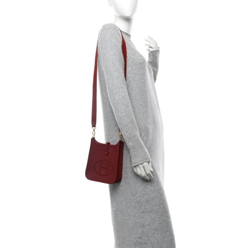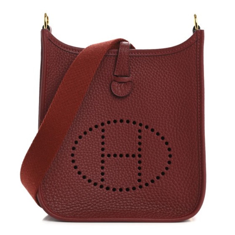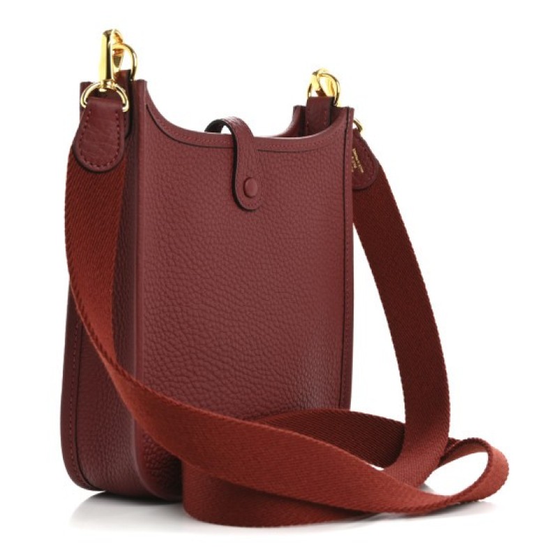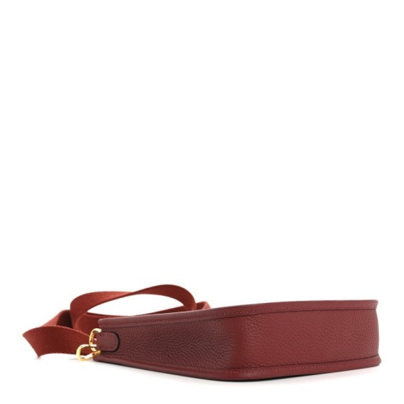 This is an authentic HERMES Taurillon Clemence Evelyne TPM in Rouge H. This petite handbag is finely crafted of dark red Clemence calfskin leather with a frontal perforated Hermes H. The bag features a red canvas shoulder strap and gold plated hardware. The top snap opens to an interior of matching red suede.